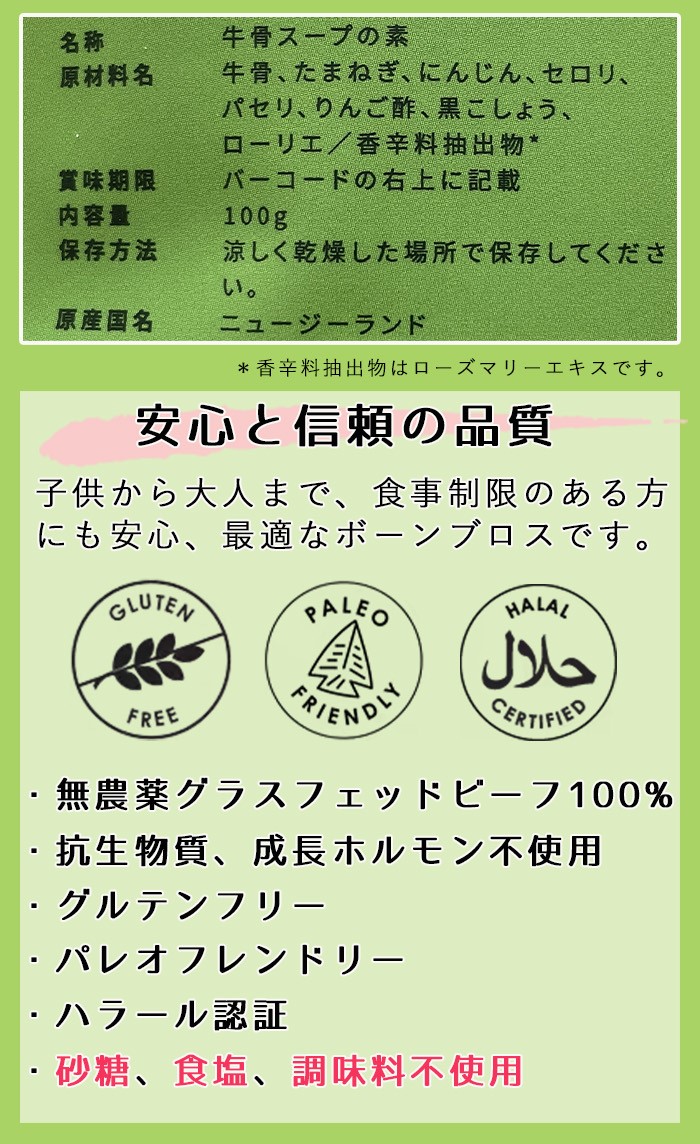 | 原材料名 | ビーフ・ボーン・ブロスの粉(牛骨、玉ねぎ、人参、セロリ、パセリ、リンゴ酢、黒コショウ、ロリエ、ローズマリーのエッセンス) |