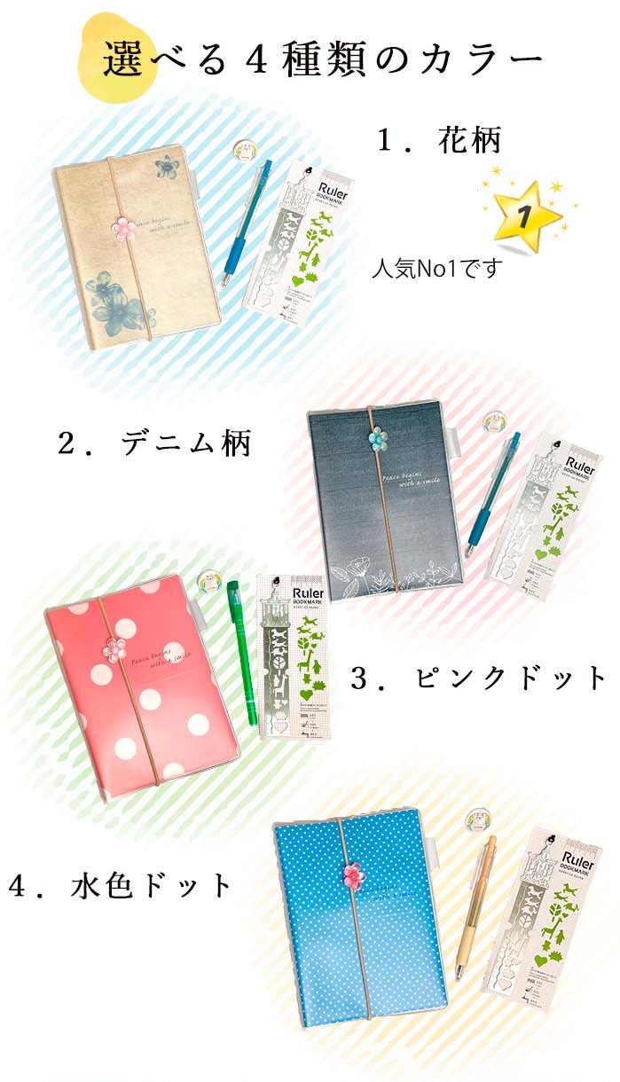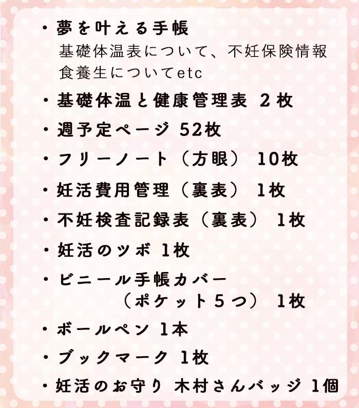 夢をかなえる手帳1冊(読み物)、基礎体温と健康管理表2枚、週予定ページ52枚、フリーノート10枚、検査結果と費用1枚、妊活ツボシート1枚
