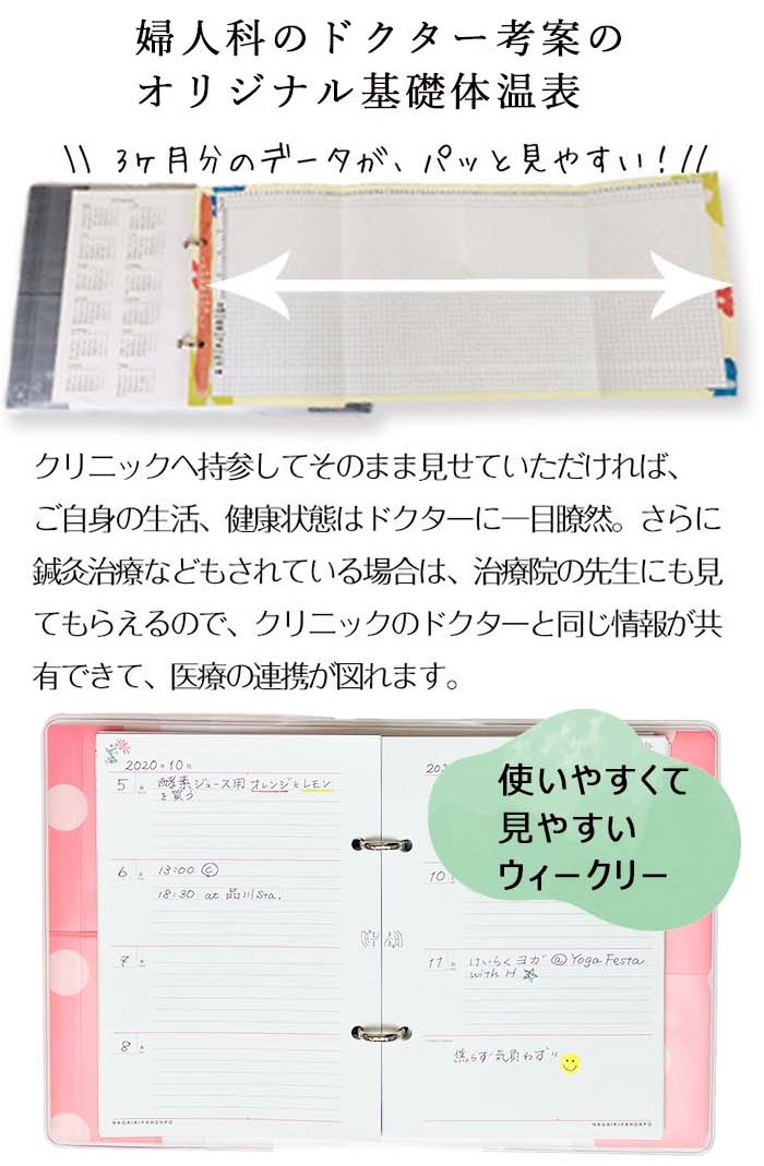 基礎体温表は毎日の基礎体温と生活、健康記録がリンクした形になっています。クリニックへ持参してそのまま見せていただければ、ご自身の生活、健康状態はドクターに一目瞭然。さらに鍼灸治療なども併用されている場合にはドクターと同じ情報を見ていただく事ができ医療の連携が図れます。