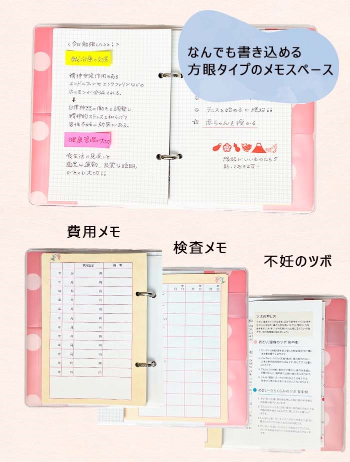 不妊に関する基礎的な情報、妊活中の健康管理や病院、プライベートなど色々なスケジュールや記録の管理ができるメモ、ノートを一つにしたシステム手帳です。